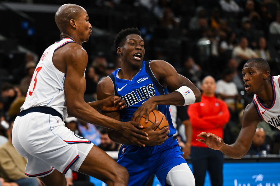 Oct 14, 2024; Inglewood, California, USA; LA Clippers forward Kai Jones (23) attempts to steal the ball from Dallas Mavericks guard Jazian Gortman (00) during the second half at Intuit Dome. Mandatory Credit: Jonathan Hui-Imagn Images