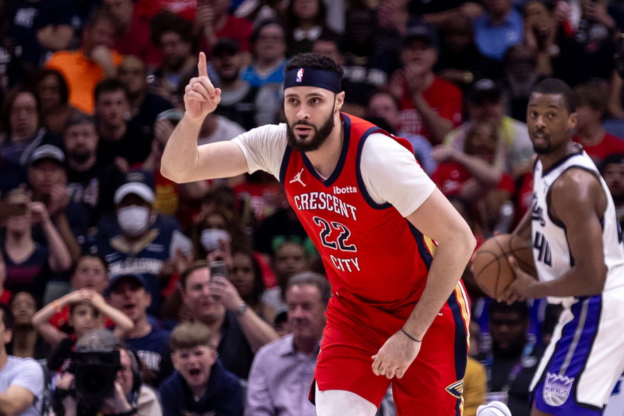 Apr 19, 2024; New Orleans, Louisiana, USA; New Orleans Pelicans forward Larry Nance Jr. (22) reacts to making a basket against Sacramento Kings forward Harrison Barnes (40) in the second half during a play-in game of the 2024 NBA playoffs at Smoothie King Center. Mandatory Credit: Stephen Lew-USA TODAY Sports