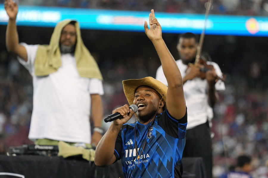 Jul 1, 2023; Stanford, California, USA; Rapper LaRussell performs during halftime of the game between the San Jose Earthquakes and the Los Angeles Galaxy at Stanford Stadium. Mandatory Credit: Darren Yamashita-USA TODAY Sports