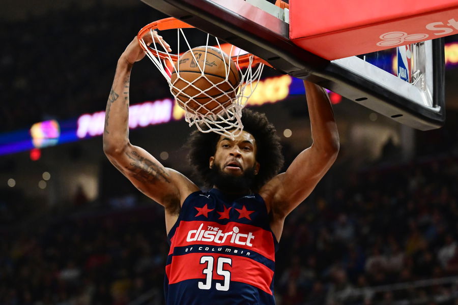 Dec 13, 2024; Cleveland, Ohio, USA; Washington Wizards forward Marvin Bagley III (35) dunks during the first half against the Cleveland Cavaliers at Rocket Mortgage FieldHouse. Mandatory Credit: Ken Blaze-Imagn Images