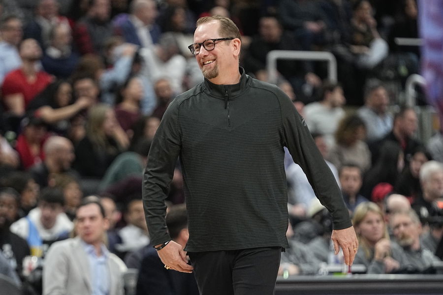 Mar 14, 2023; Toronto, Ontario, CAN; Toronto Raptors head coach Nick Nurse reacts after a play against the Denver Nuggets during the second half at Scotiabank Arena. Mandatory Credit: John E. Sokolowski-USA TODAY Sports