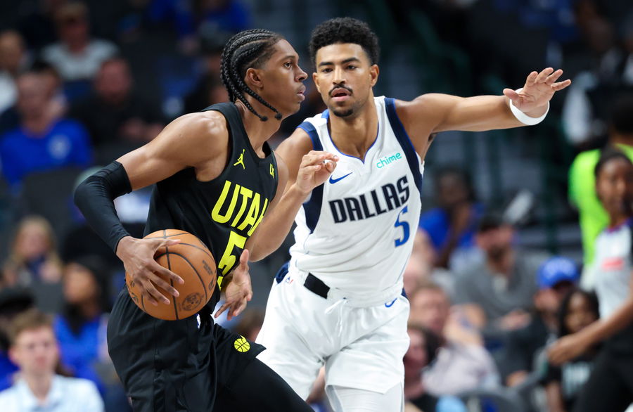Oct 10, 2024; Dallas, Texas, USA; Utah Jazz forward Cody Williams (5) looks to pass as Dallas Mavericks guard Quentin Grimes (5) defends during the first quarter at American Airlines Center. Mandatory Credit: Kevin Jairaj-Imagn Images