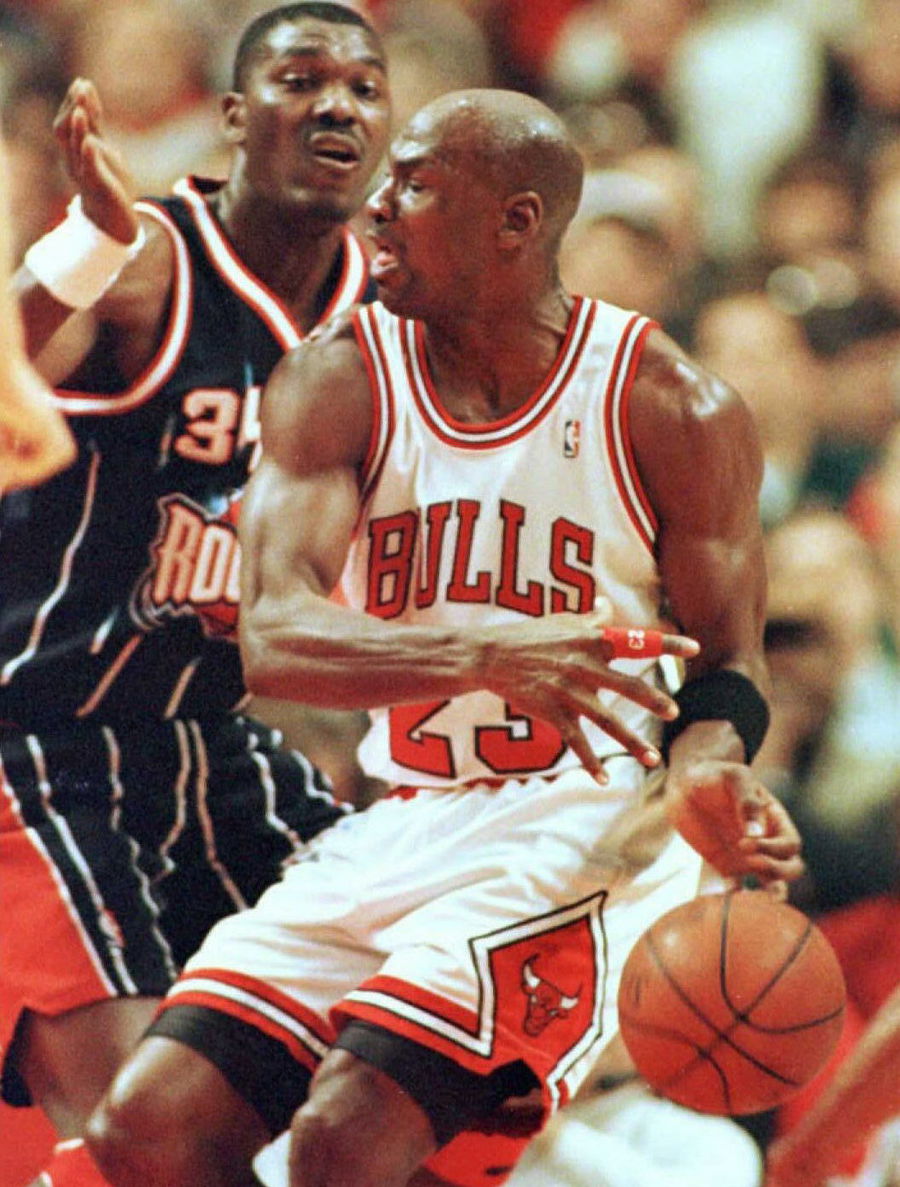 Chicago Bulls guard Michael Jordan(R) loses the ball as he tries to drive to the basket against Houston Rockets center Hakeem Olajuwon 03 January during the first quarter at the United Center in Chicago. The Bulls currently have a record of 15-0 at home this season. AFP PHOTO Brian BAHR/cw (Photo by BRIAN BAHR / AFP) (Photo credit should read BRIAN BAHR/AFP via Getty Images)
