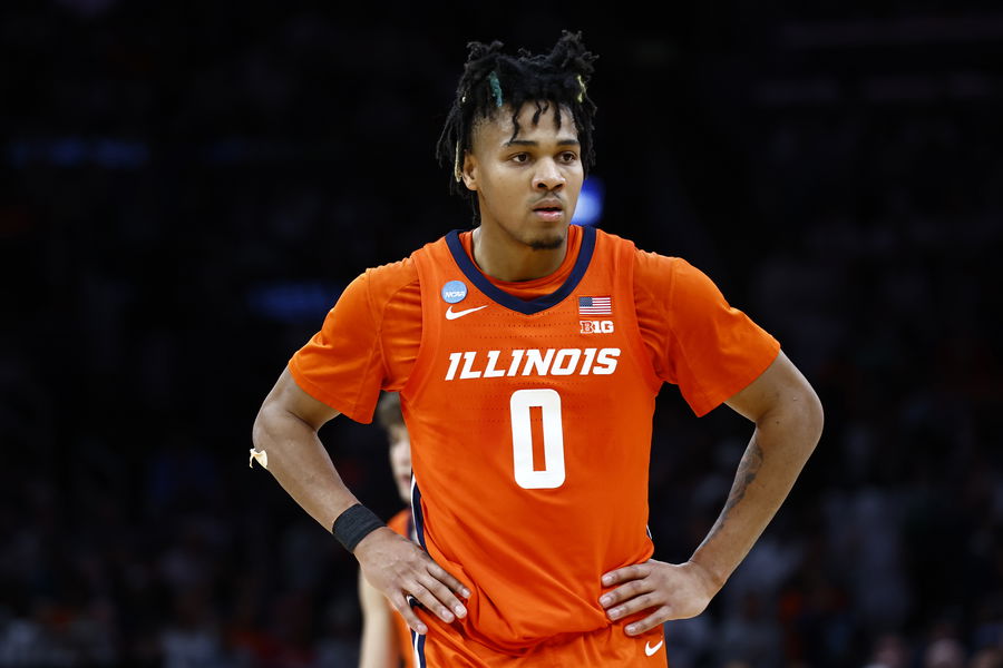 Mar 30, 2024; Boston, MA, USA; Illinois Fighting Illini guard Terrence Shannon Jr. (0) reacts against the Connecticut Huskies in the finals of the East Regional of the 2024 NCAA Tournament at TD Garden. Mandatory Credit: Winslow Townson-USA TODAY Sports