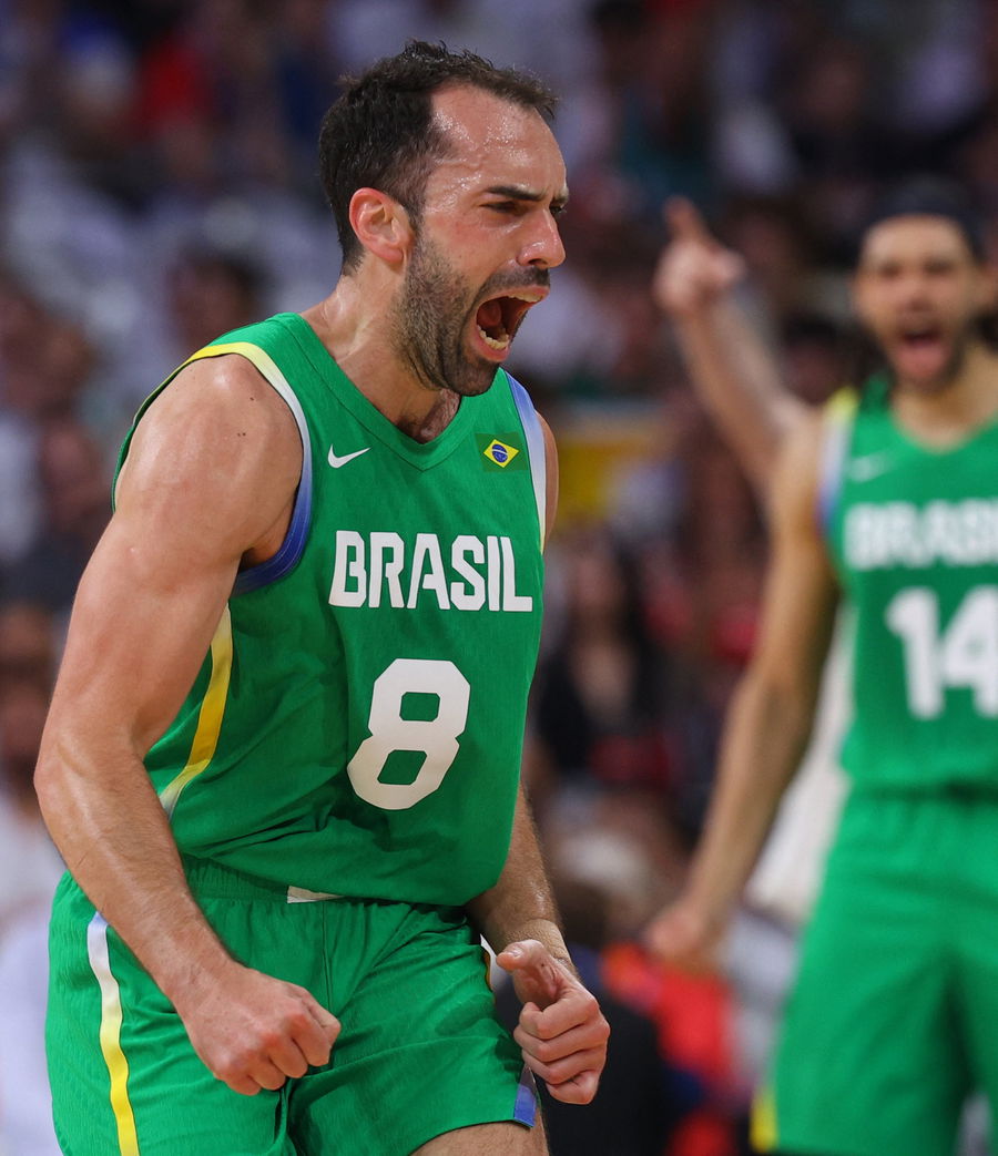 Paris 2024 Olympics – Basketball – Men’s Group Phase – Group B – Japan vs Brazil – Lille, Pierre Mauroy Stadium, Villeneve-d’Ascq, France – August 02, 2024. Vitor Benite of Brazil reacts REUTERS/Brian Snyder