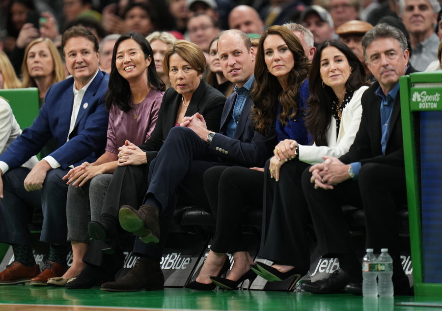 Nov 30, 2022; Boston, Massachusetts, USA; (L to R) Boston Celtics co-owner Stephen Pagliuca, Boston Mayor Michelle Wu, Governor Elect Maura Healey, William, Prince of Wales, Catherine, Princess of Wales Emilia Fazzalari and Celtics co-owner Wyc Grousbeck court side during the game against the Boston Celtics and Miami Heat at TD Garden. Mandatory Credit: David Butler II-USA TODAY Sports