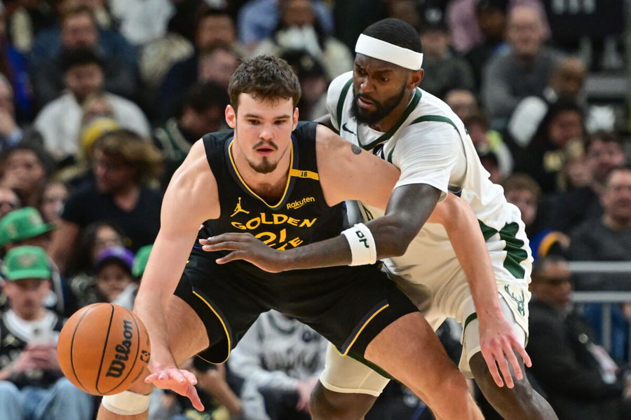 Feb 10, 2025; Milwaukee, Wisconsin, USA; Golden State Warriors forward Quinten Post (21) gets pressure from Milwaukee Bucks forward Bobby Portis (9) in the fourth quarter at Fiserv Forum. Mandatory Credit: Benny Sieu-Imagn Images