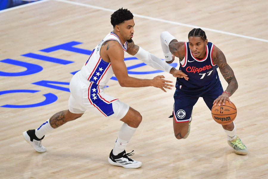 Nov 6, 2024; Inglewood, California, USA; Los Angeles Clippers guard Kevin Porter Jr. (77) moves the ball against Philadelphia 76ers forward KJ Martin (1) during the first half at Intuit Dome. Mandatory Credit: Gary A. Vasquez-Imagn Images