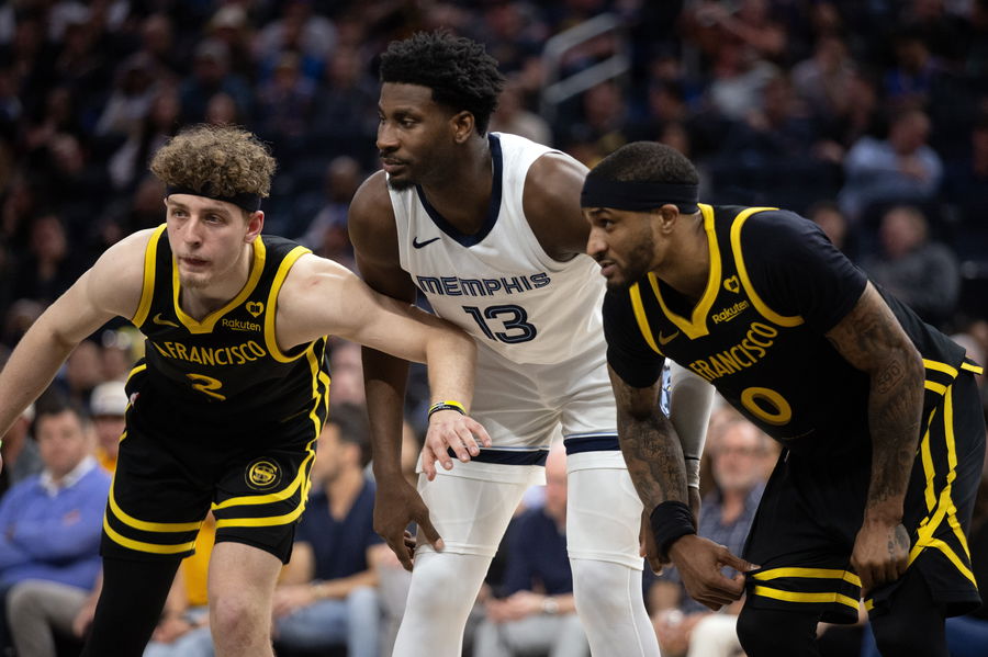 Mar 20, 2024; San Francisco, California, USA; Golden State Warriors guards Brandin Podziemski (2) and Gary Payton II (0) bookend Memphis Grizzlies forward Jaren Jackson Jr. (13) as they await a foul shot during the third quarter at Chase Center. Mandatory Credit: D. Ross Cameron-USA TODAY Sports