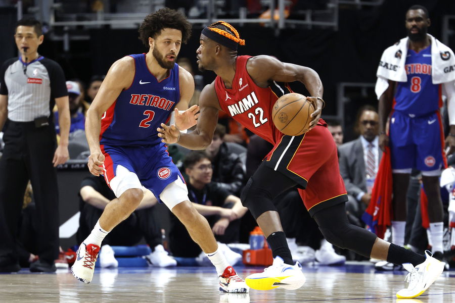 Dec 16, 2024; Detroit, Michigan, USA; Miami Heat forward Jimmy Butler (22) controls the ball as Detroit Pistons guard Cade Cunningham (2) defends in the second half at Little Caesars Arena. Mandatory Credit: Rick Osentoski-Imagn Images
