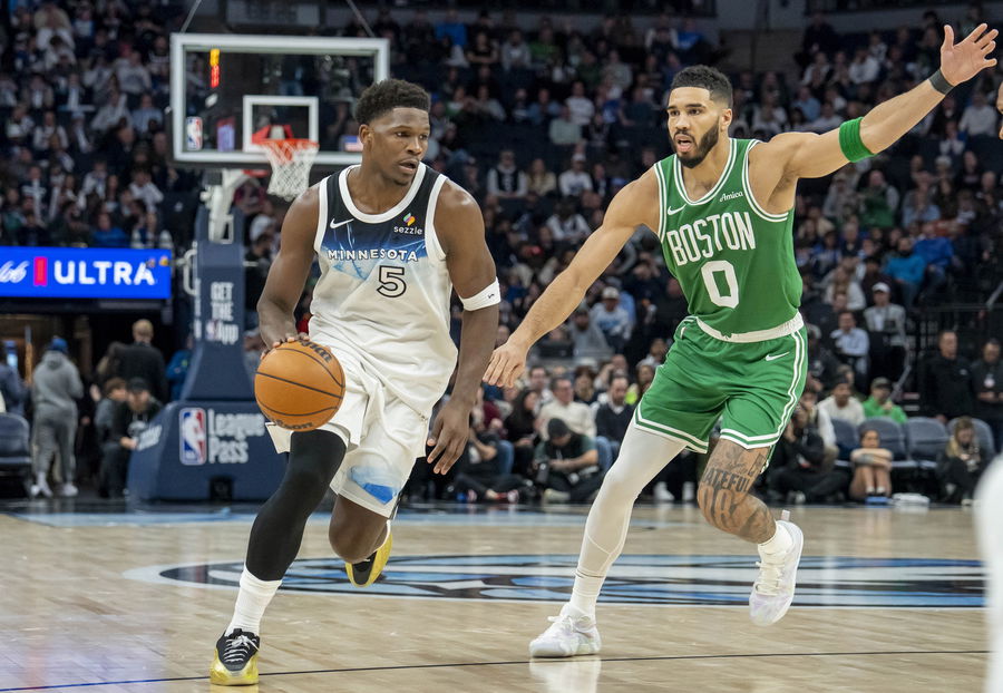 Jan 2, 2025; Minneapolis, Minnesota, USA; Minnesota Timberwolves guard Anthony Edwards (5) dribbles past Boston Celtics forward Jayson Tatum (0) in the second half at Target Center. Mandatory Credit: Jesse Johnson-Imagn Images