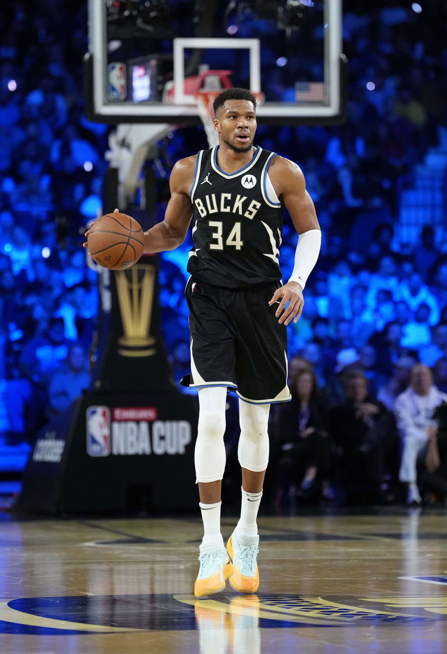 Dec 17, 2024; Las Vegas, Nevada, USA; Milwaukee Bucks forward Giannis Antetokounmpo (34) dribbles during the 3rd quarter of the Emirates NBA Cup championship game against the Oklahoma City Thunder at T-Mobile Arena. Mandatory Credit: Kyle Terada-Imagn Images