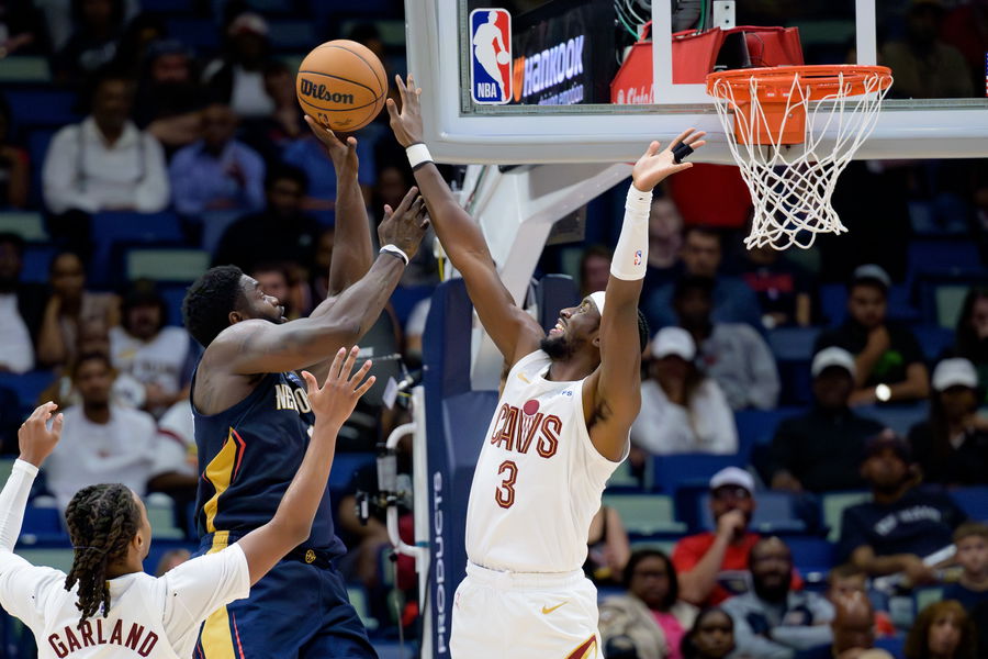 Nov 6, 2024; New Orleans, Louisiana, USA; New Orleans Pelicans forward Zion Williamson (1) shoots over Cleveland Cavaliers guard Caris LeVert (3) during the fourth quarter at Smoothie King Center. Mandatory Credit: Matthew Hinton-Imagn Images