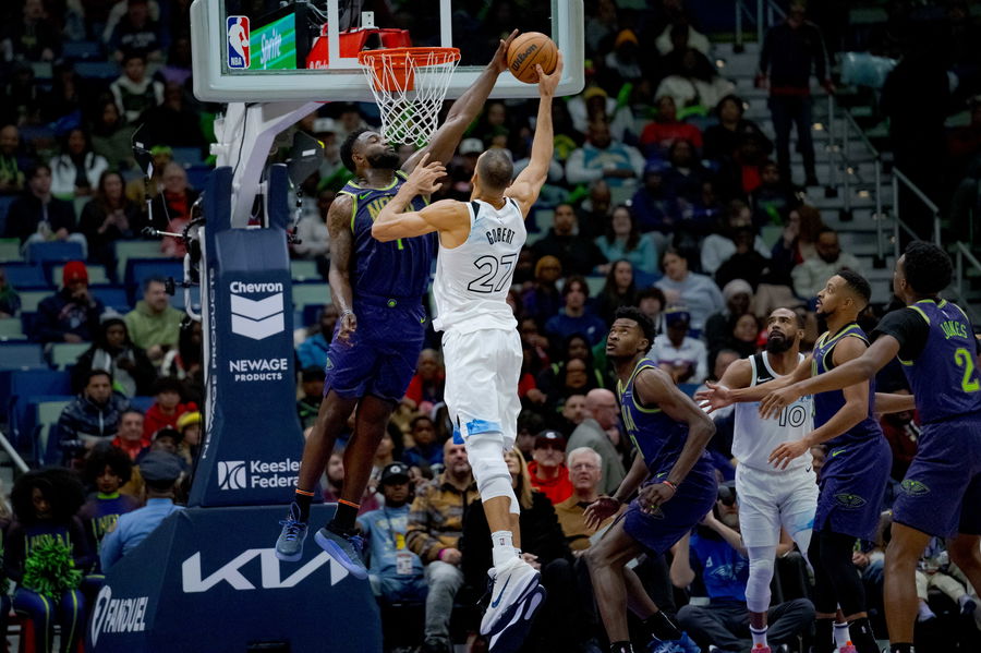 Jan 7, 2025; New Orleans, Louisiana, USA; New Orleans Pelicans forward Zion Williamson (1) blocks the shot of Minnesota Timberwolves center Rudy Gobert (27) during the first half at Smoothie King Center. Mandatory Credit: Matthew Hinton-Imagn Images