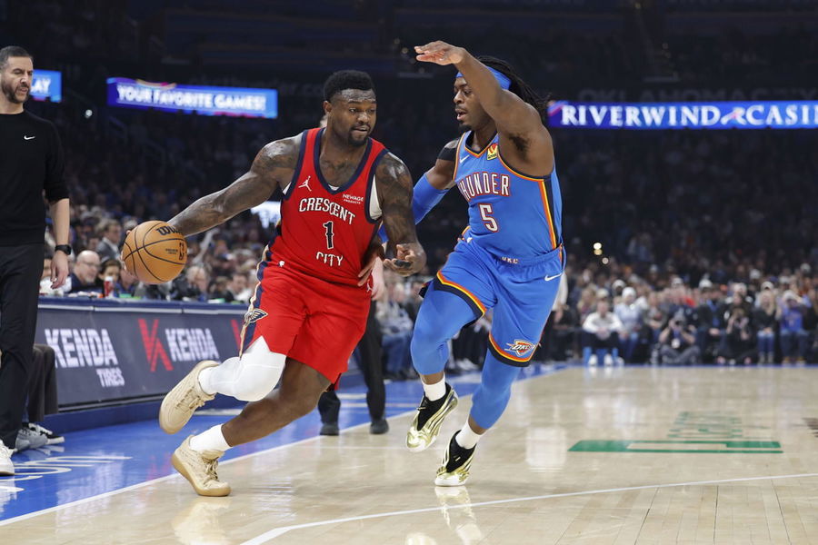 Jan 27, 2026; Oklahoma City, Oklahoma, USA; New Orleans Pelicans forward Zion Williamson (1) drives against Oklahoma City Thunder guard Luguentz Dort (5) during the second quarter at Paycom Center. Mandatory Credit: Alonzo Adams-Imagn Images