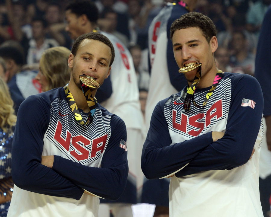 MADRID, SPAIN – SEPTEMBER 14: Gold medallists US players Stephen Curry (L) and Clay Thompson (R) pose with their medals after winning the 2014 FIBA World Cup Final basketball match between USA and Serbia at the Palacio de Deportes in Madrid, Spain on September 14, 2014. (Photo by Evrim Aydin/Anadolu Ajans/Getty Images)