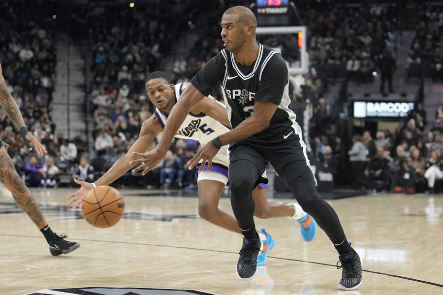 Dec 6, 2024; San Antonio, Texas, USA; San Antonio Spurs guard Chris Paul (3) passes the ball while defended by Sacramento Kings guard De’Aaron Fox (5) during the first half at Frost Bank Center. Mandatory Credit: Scott Wachter-Imagn Images