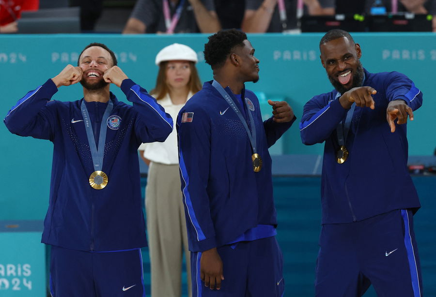 Paris 2024 Olympics – Basketball – Men’s Victory Ceremony – Bercy Arena, Paris, France – August 10, 2024. Stephen Curry of United States, Joel Embiid of United States and Lebron James of United States celebrate on the podium with their medals. REUTERS/Stephanie Lecocq