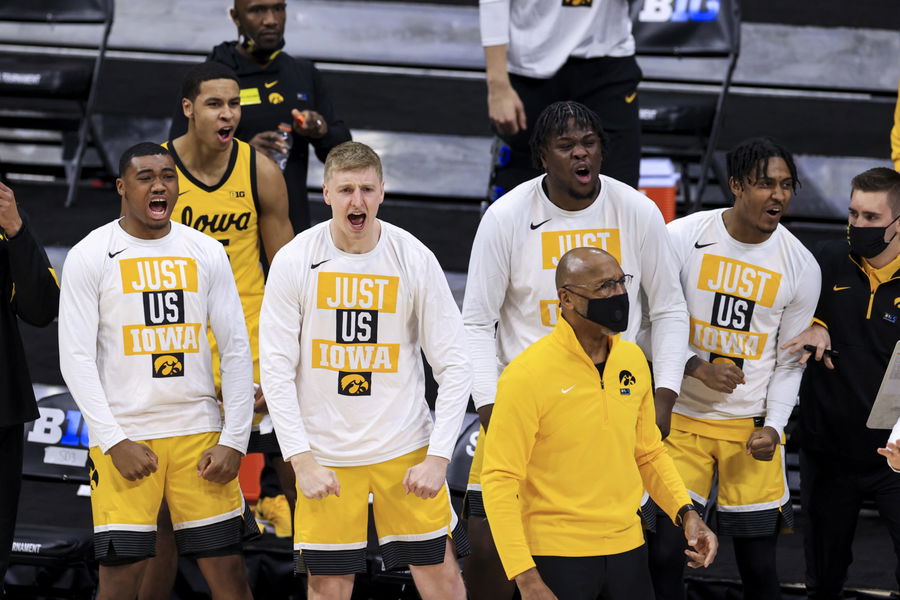 Mar 12, 2021; Indianapolis, Indiana, USA; Members of the Iowa Hawkeyes react on the bench during the game against the Wisconsin Badgers in the second half at Lucas Oil Stadium. Mandatory Credit: Aaron Doster-USA TODAY Sports