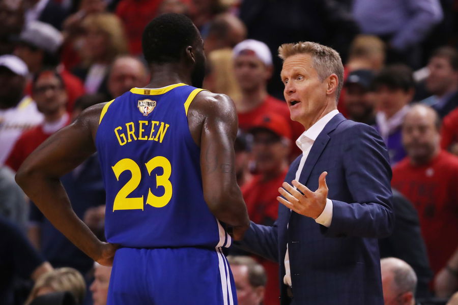 TORONTO, ONTARIO – JUNE 02: Head coach Steve Kerr of the Golden State Warriors speaks to Draymond Green #23 during a timeout against the Toronto Raptors in the first half during Game Two of the 2019 NBA Finals at Scotiabank Arena on June 02, 2019 in Toronto, Canada. (Photo by Gregory Shamus/Getty Images)