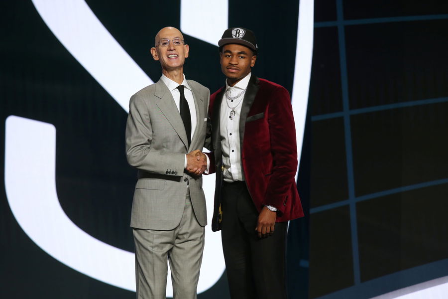 Jul 29, 2021; Brooklyn, New York, USA; Cameron Thomas (LSU) poses with NBA commissioner Adam Silver after being selected as the number twenty-seven overall pick by the Brooklyn Nets in the first round of the 2021 NBA Draft at Barclays Center. Mandatory Credit: Brad Penner-USA TODAY Sports