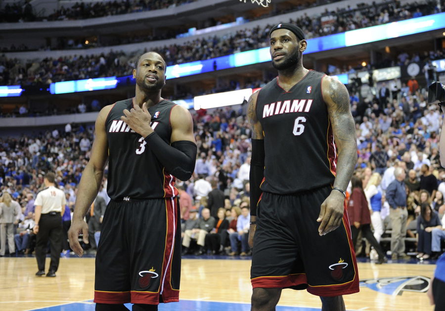 February 18, 2014: Miami Heat shooting guard Dwyane Wade #3 and Miami Heat small forward LeBron James #6 chat during halftime during an NBA game between the Miami Heat and the Dallas Mavericks at the American Airlines Center in Dallas, TX Miami defeated Dallas 117-106 (Photo by Albert Pena/Icon SMI/Corbis/Icon Sportswire via Getty Images)