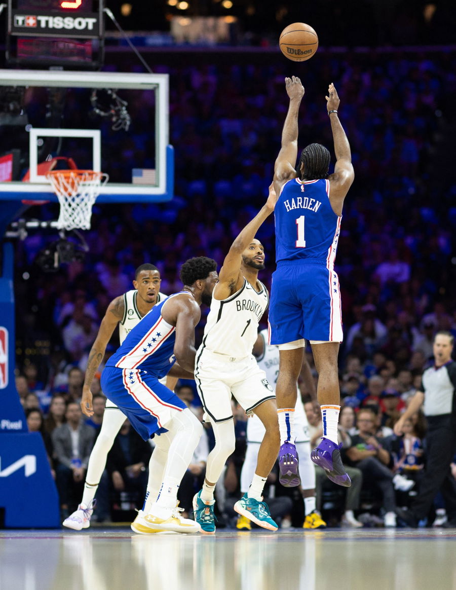 Apr 17, 2023; Philadelphia, Pennsylvania, USA; Philadelphia 76ers guard James Harden (1) shoots the ball in front of Brooklyn Nets forward Mikal Bridges (1) during the first quarter in game two of the 2023 NBA playoffs at Wells Fargo Center. Mandatory Credit: Bill Streicher-USA TODAY Sports