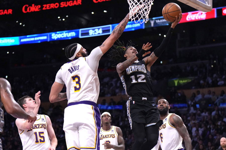 Apr 22, 2023; Los Angeles, California, USA; Memphis Grizzlies guard Ja Morant (12) shoots the ball against Los Angeles Lakers forward Anthony Davis (3) in the fourth quarter during game three of the 2023 NBA playoffs at Crypto.com Arena. Mandatory Credit: Kirby Lee-USA TODAY Sports