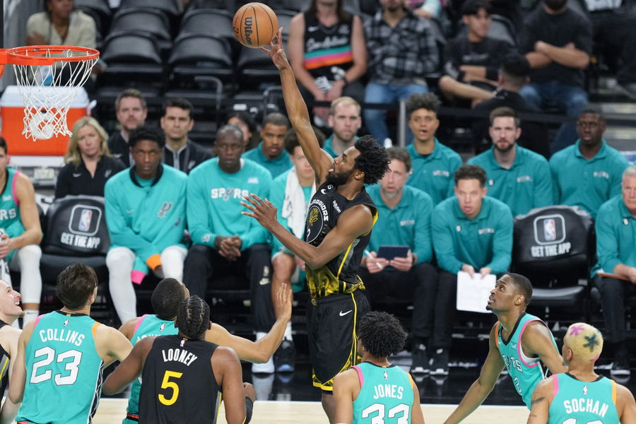 Jan 13, 2023; San Antonio, Texas, USA; Golden State Warriors forward Andrew Wiggins (22) shoots in the second half against the San Antonio Spurs at the Alamodome. Mandatory Credit: Daniel Dunn-USA TODAY Sports