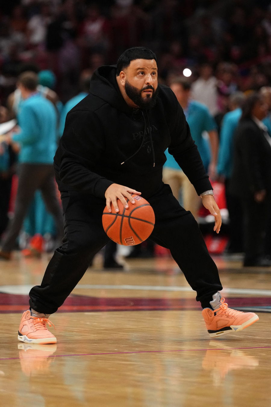 Nov 12, 2022; Miami, Florida, USA; American music producer DJ Khaled dribbles the ball during a time out in the second half between the Miami Heat and the Charlotte Hornets at FTX Arena. Mandatory Credit: Jasen Vinlove-USA TODAY Sports