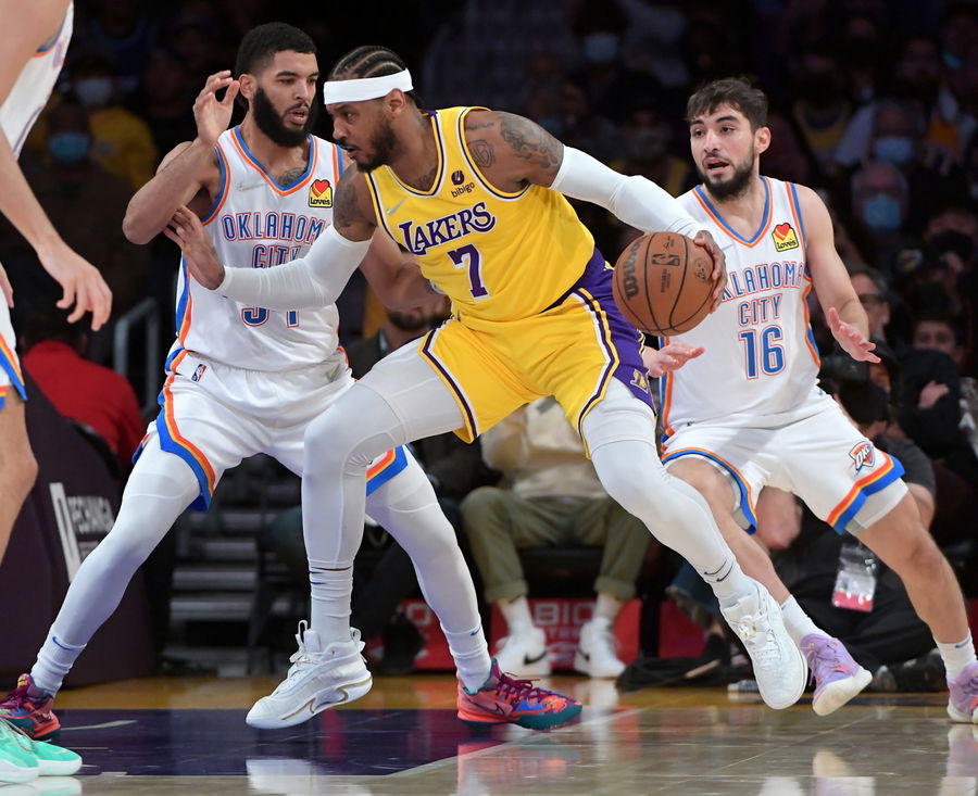 Nov 4, 2021; Kenrich Williams and guard Ty Jerome defend Carmelo Anthony as he drives to the basket at Staples Center. Mandatory Credit: Jayne Kamin-Oncea-USA TODAY Sports