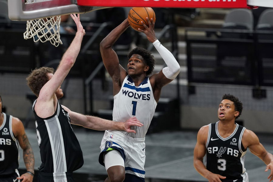 Feb 3, 2021; San Antonio, Texas, USA; Minnesota Timberwolves guard Anthony Edwards (1) shoots in the second half against the San Antonio Spurs at the AT&T Center. Mandatory Credit: Daniel Dunn-USA TODAY Sports
