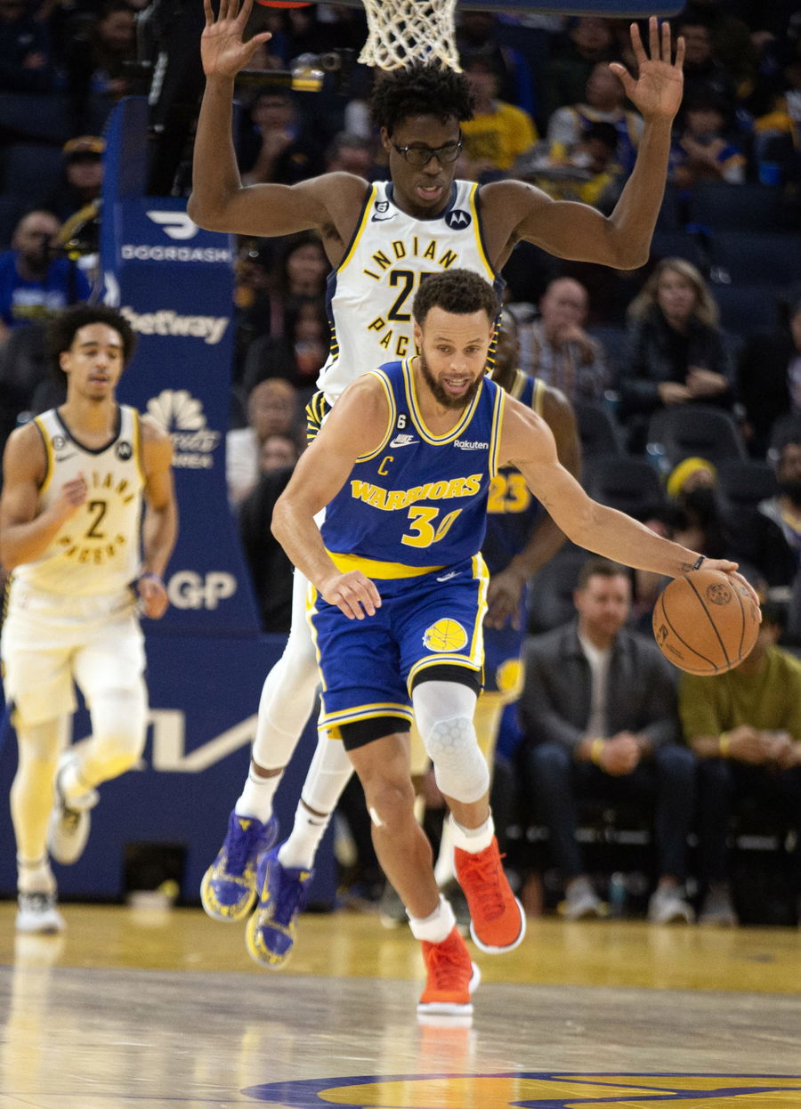Dec 5, 2022; San Francisco, California, USA; Golden State Warriors guard Stephen Curry (30) dribbles past Indiana Pacers forward Jalen Smith (25) during the third quarter at Chase Center. Mandatory Credit: D. Ross Cameron-USA TODAY Sports