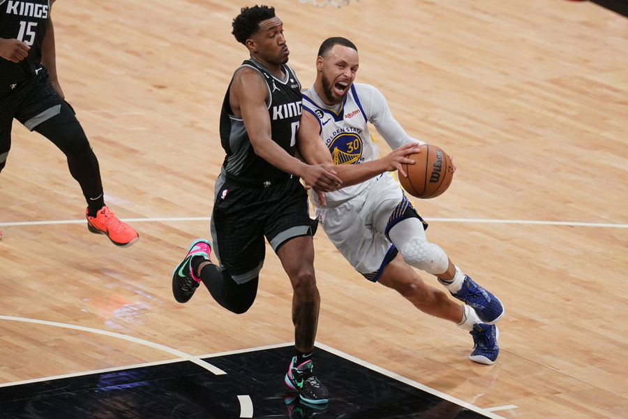 NBA, Basketball Herren, USA Playoffs-Golden State Warriors at Sacramento Kings Apr 15, 2023 Sacramento, California, USA Golden State Warriors guard Stephen Curry 30 drives past Sacramento Kings guard Malik Monk 0 in the fourth quarter during game one of the 2023 NBA playoffs at the Golden 1 Center. Sacramento Golden 1 Center California USA, EDITORIAL USE ONLY PUBLICATIONxINxGERxSUIxAUTxONLY Copyright: xCaryxEdmondsonx 20230415_tdc_se9_0368