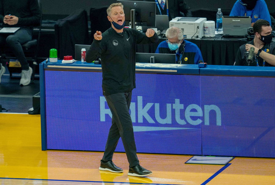 Warriors head coach Steve Kerr calls out from the sidelines during the first quarter against the Kings at Chase Center. Mandatory Credit: Neville E. Guard-USA TODAY Sports