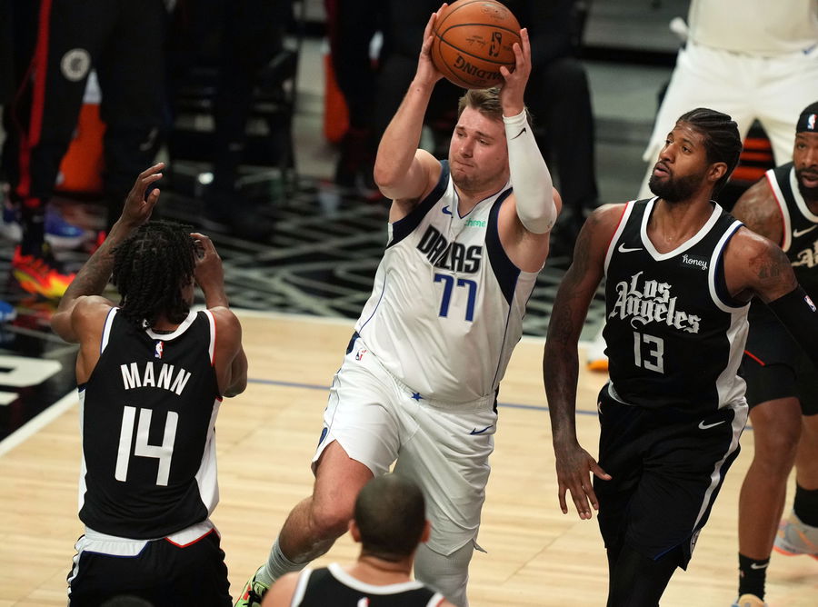 Jun 6, 2021; Los Angeles, California, USA; Dallas Mavericks guard Luka Doncic (77) controls the ball against Los Angeles Clippers guard Terance Mann (14) during the second half in game seven of the first round of the 2021 NBA Playoffs. at Staples Center. Mandatory Credit: Kirby Lee-USA TODAY Sports
