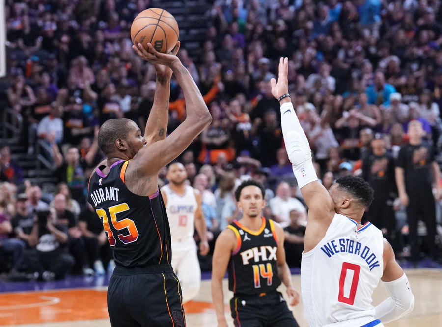 Apr 16, 2023; Phoenix, Arizona, USA; Phoenix Suns forward Kevin Durant (35) shoots over LA Clippers guard Russell Westbrook (0) during the first half of game one of the 2023 NBA playoffs at Footprint Center. Mandatory Credit: Joe Camporeale-USA TODAY Sports