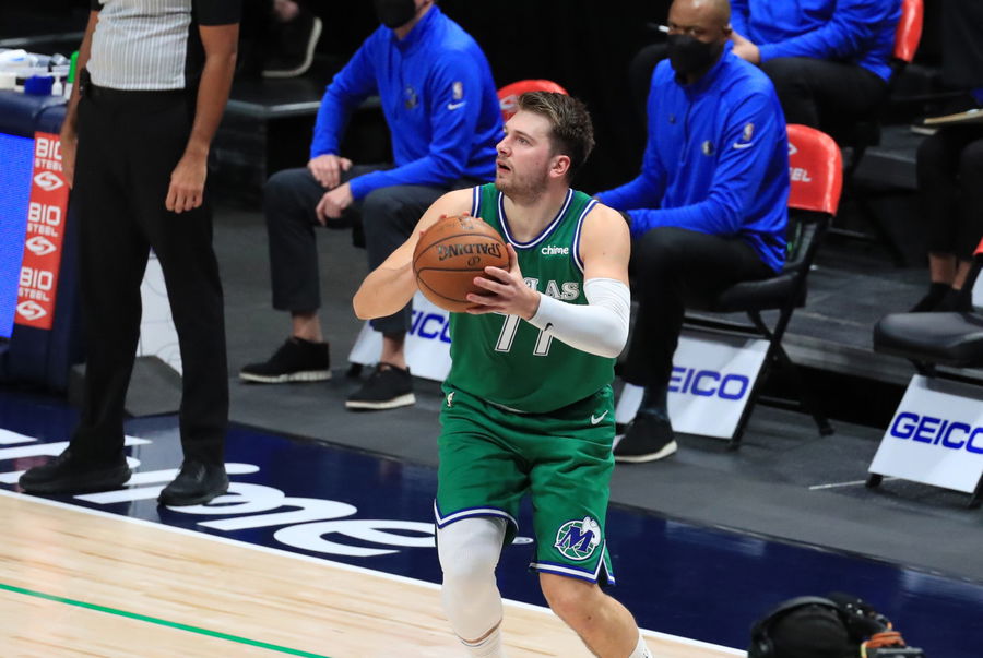 Feb 8, 2021; Dallas, Texas, USA; Dallas Mavericks guard Luka Doncic (77) shoots during the first half against the Minnesota Timberwolves at American Airlines Center. Mandatory Credit: Kevin Jairaj-USA TODAY Sports