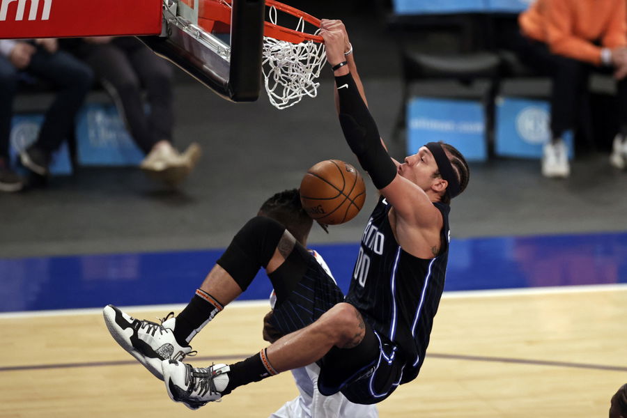 Mar 18, 2021; New York, New York, USA; Orlando Magic forward Aaron Gordon dunks the ball during the second half of an NBA basketball game against the New York Knicks on Thursday, March 18, 2021, in New York. Mandatory Credit: Adam Hunger/Pool Photo-USA TODAY Sports