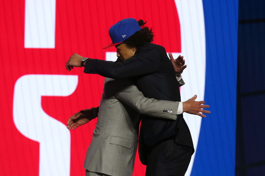 Jul 29, 2021; Brooklyn, New York, USA; Cade Cunningham (Oklahoma State) hugs NBA commissioner Adam Silver after being selected as the number one overall pick by the Detroit Pistons in the first round of the 2021 NBA Draft at Barclays Center. Mandatory Credit: Brad Penner-USA TODAY Sports