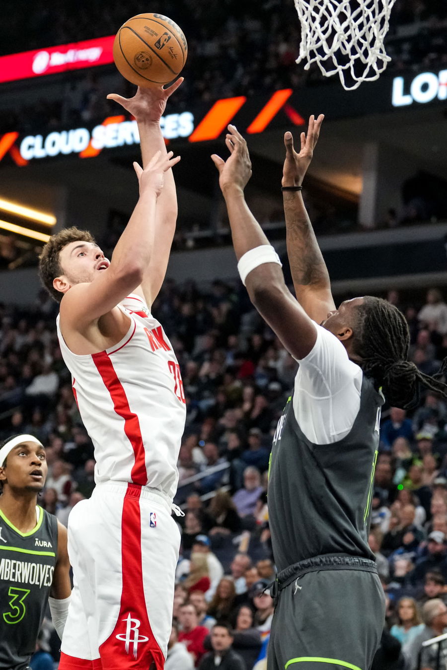 Jan 21, 2023; Minneapolis, Minnesota, USA; Houston Rockets center Alperen Sengun (28) shoots during the second quarter against the Minnesota Timberwolves at Target Center. Mandatory Credit: Brace Hemmelgarn-USA TODAY Sports