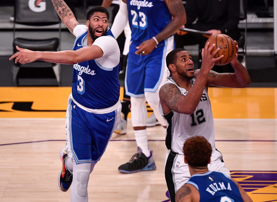 Jan 7, 2021; Los Angeles, California, USA; San Antonio Spurs forward LaMarcus Aldridge (12) drives to the basket past Los Angeles Lakers forward Anthony Davis (3) in the third quarter at Staples Center. Mandatory Credit: Robert Hanashiro-USA TODAY Sports