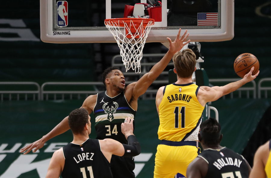 Feb 3, 2021; Milwaukee, WI, USA; Indiana Pacers forward Domantas Sabonis (11) shoots against Milwaukee Bucks forward Giannis Antetokounmpo (34) at the Bradley Center. Mandatory Credit: Nick Monroe/Handout Photo via USA TODAY Sports