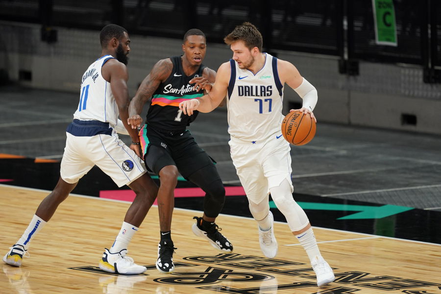 Jan 22, 2021; San Antonio, Texas, USA; Dallas Mavericks guard Luka Doncic (77) dribbles past San Antonio Spurs guard Lonnie Walker IV (1) during the first half at the AT&T Center. Mandatory Credit: Daniel Dunn-USA TODAY Sports