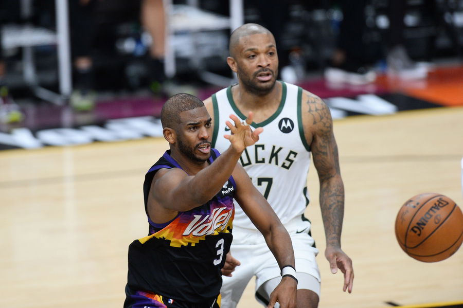 Jul 17, 2021; Chris Paul (3) passes the ball in front of P.J. Tucker (17) during game five of the 2021 NBA Finals at Phoenix Suns Arena. Mandatory Credit: Joe Camporeale-USA TODAY Sports