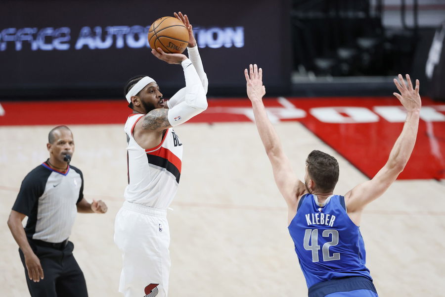 Mar 19, 2021; Portland, Oregon, USA; Portland Trail Blazers power forward Carmelo Anthony (00) shoots the ball over Dallas Mavericks power forward Maxi Kleber (42) during the first half at Moda Center. Mandatory Credit: Soobum Im-USA TODAY Sports