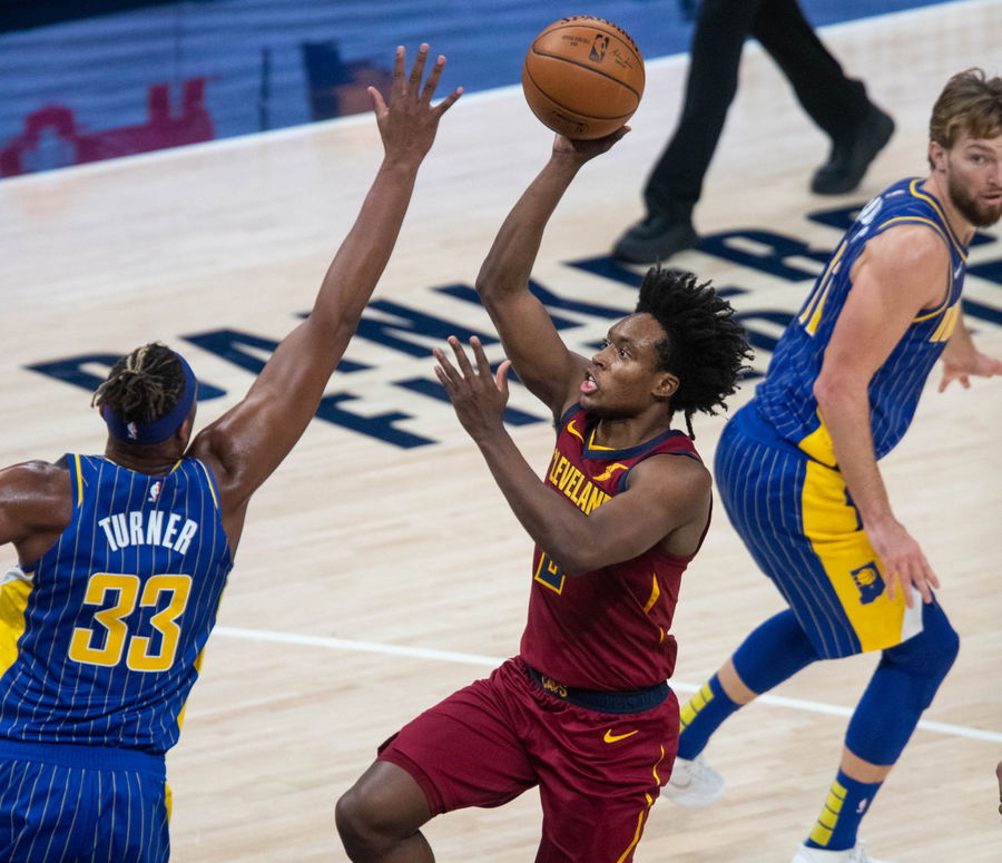 Dec 31, 2020; Indianapolis, Indiana, USA; Cleveland Cavaliers guard Collin Sexton (2) shoots the ball while Indiana Pacers center Myles Turner (33) defends in the fourth quarter at Bankers Life Fieldhouse. Mandatory Credit: Trevor Ruszkowski-USA TODAY Sports