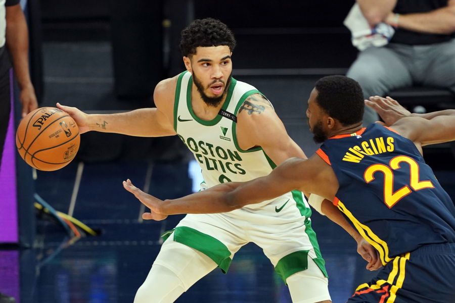 Feb 2, 2021; San Francisco, California, USA; Boston Celtics forward Jayson Tatum (0) handles the ball while being defended by Golden State Warriors forward Andrew Wiggins (22) during the third quarter at Chase Center. Mandatory Credit: Darren Yamashita-USA TODAY Sports