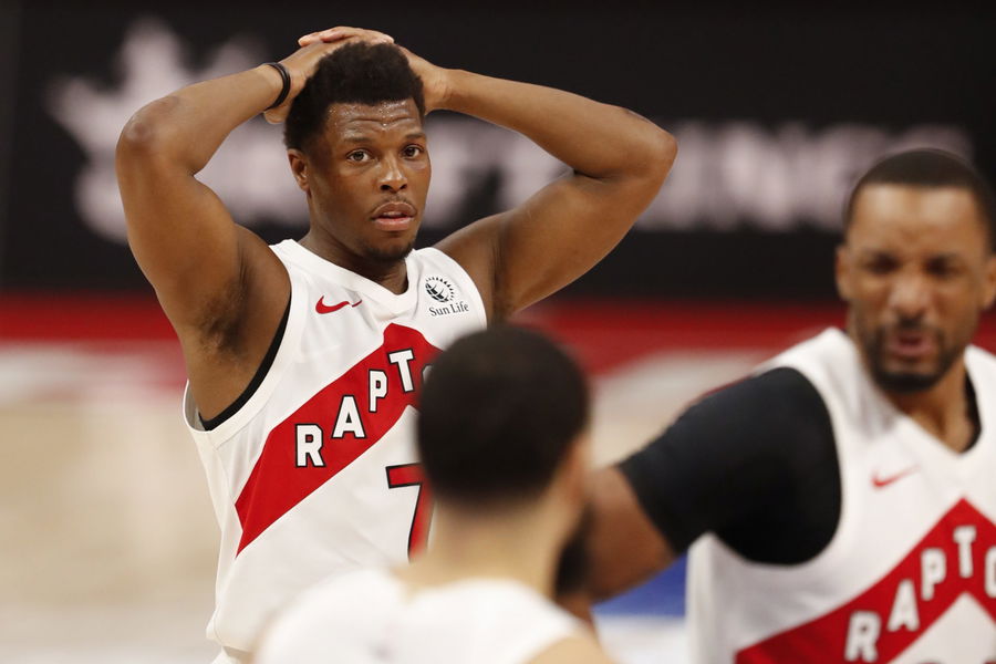 Mar 17, 2021; Detroit, Michigan, USA; Toronto Raptors guard Kyle Lowry (7) puts his hands on his head during the fourth quarter against the Detroit Pistons at Little Caesars Arena. Mandatory Credit: Raj Mehta-USA TODAY Sports