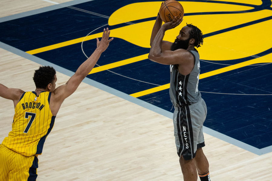 Mar 17, 2021; Indianapolis, Indiana, USA; Brooklyn Nets guard James Harden (13) shoots the ball while Indiana Pacers guard Malcolm Brogdon (7) defends in the third quarter at Bankers Life Fieldhouse. Mandatory Credit: Trevor Ruszkowski-USA TODAY Sports